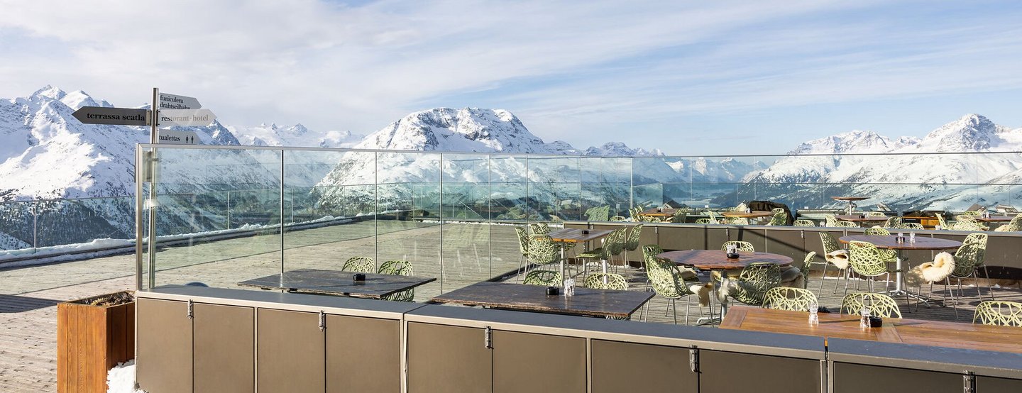 Schöner geht's kaum: Der Ausblick auf das gesamte Oberengadiner Seenplateau macht unsere Sonnenterrasse auf Muottas Muragl zu einer der beliebtesten im ganzen Tal. Hier können Sie den Blick in die Weite schweifen lassen, tief einatmen, sich vom Restaurant-Team verwöhnen lassen und einfach nur geniessen.