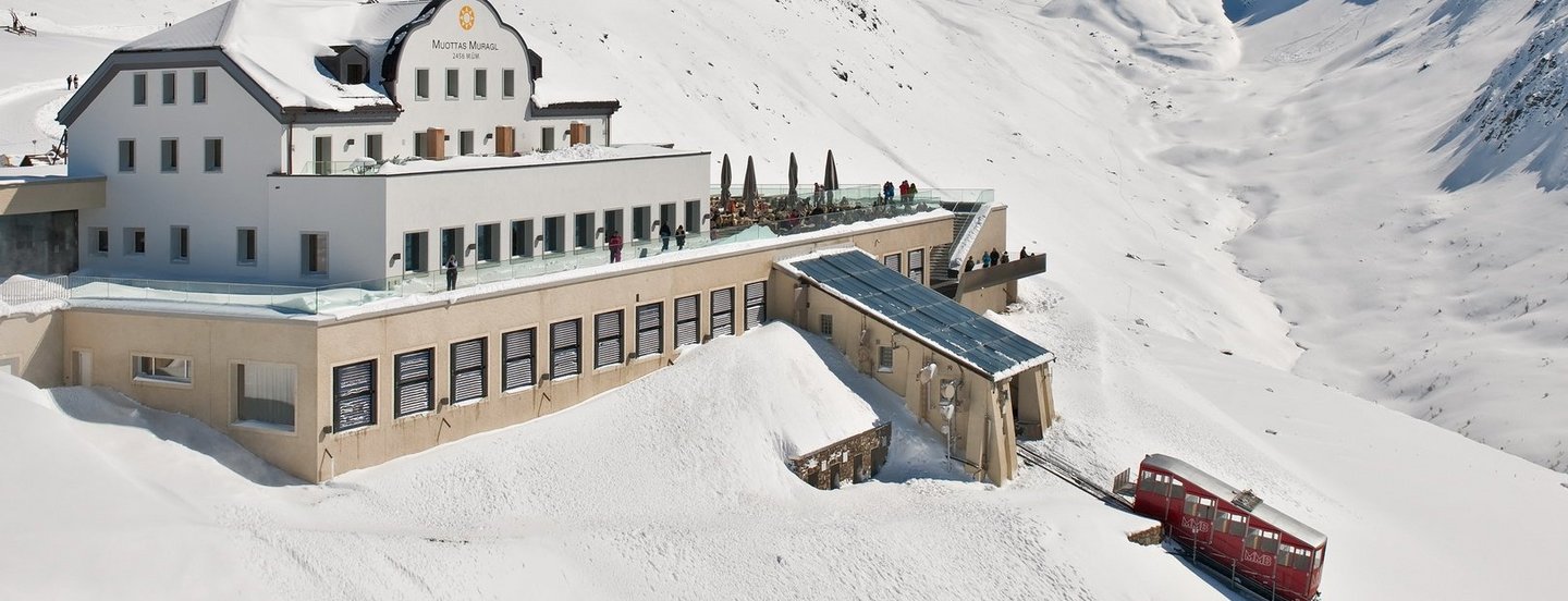 56 m² Röhrenkollektoren in den Scheiben der Fenster des Sockelgeschosses liefern die nötige Energie für das Warmwasser im Romantik Hotel Muottas Muragl. 16 Erdsonden mit einer mittleren Länge von 200 Meter, total 3200 Meter, versorgen das gesamte Gebäude mit Erdwärme. Zusätzlich sorgt entlang des Bahntrasses auf 228 Metern die effizienteste Photovoltaikanlage der Schweiz für die Generation der benötigten elektrischen Energie. Falls überschüssige Sonnenenergie verfügbar ist, wird diese über die Erdsonden im Erdreich gespeichert. Dadurch regeneriert sich die Erdspeichermasse. Die Abwärme von Kühlanlagen, die Wärmerückgewinnung aus der Abluft sowie aus der Abwärme des Maschinenraums sind weitere ergänzende Massnahmen, welche aus dem neuen Gebäude einen nachhaltigen und umweltfreundlichen Betrieb machen. In der Jahresbilanz produziert der Berg übrigens sogar mehr Energie, als das Gebäude benötigt.