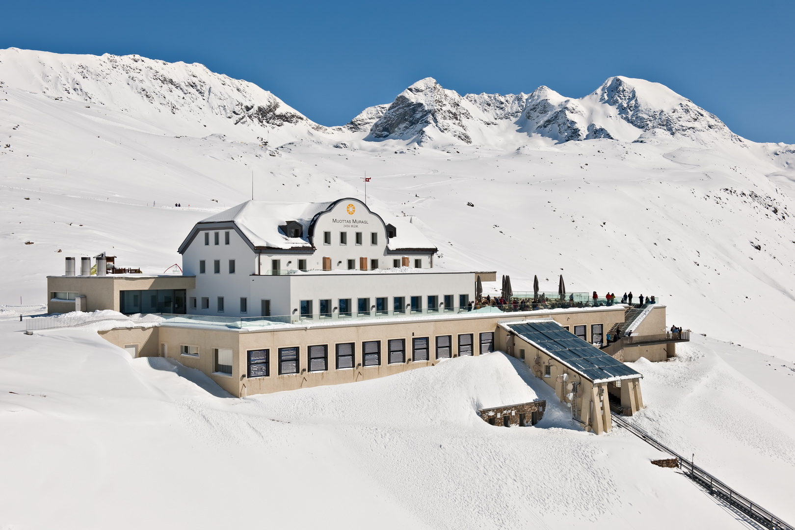 The Romantik Hotel Muottas Muragl, which is over one hundred years old, shows that high-level hotel comfort can also be realised at 2456 meters above sea level in the PlusEnergyBuilding sector. The Solar Agency particularly emphasized that thanks to the expansion and renovation, the total energy requirement was reduced by 64%, from 436000 kWh/a to 157400 kWh/a. The hotel's energy efficiency was also improved by the fact that the energy consumption of the building was reduced by 50%. Equally positive was the fact that the previous annual demand of approx. 40,000 liters of heating oil and the household and operating electricity of 36600 kWh/a are now 100% covered by solar energy, and that CO2 emissions have been reduced by 144 tons per year and thus also by 100%.