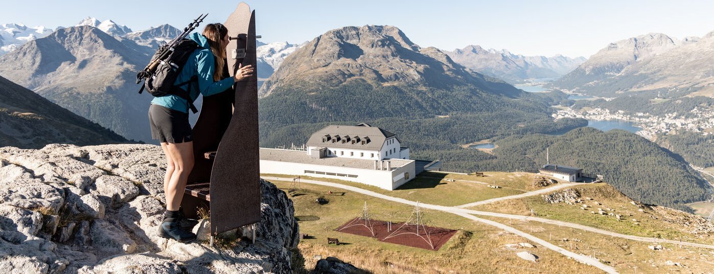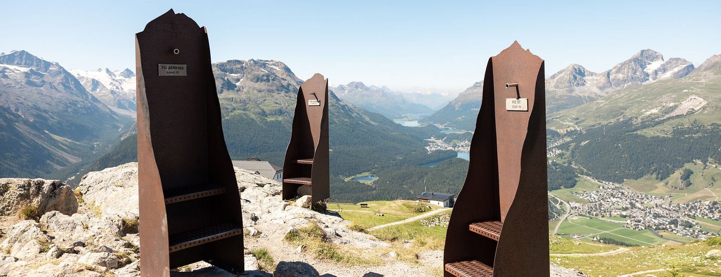 The «Ils Trais Piz» mountain peeker, made from corten steel, was inspired by Fabian Forrer, a member of the technical staff at Engadin St. Moritz Mountains AG. With so many impressive mountain peaks, it is difficult to remember all the names. With the help of the mountain peeker, we promise that from now on you will always be able to recall the world-famous, ice and snowcovered Bianco ridge of the Piz Bernina (4049 m.a.s.l.), the Piz Julier (3380 m.a.s.l.) and the Piz Ot (3246 m.a.s.l.). See for yourself and catch a glimpse of the three imposing mountain peaks.