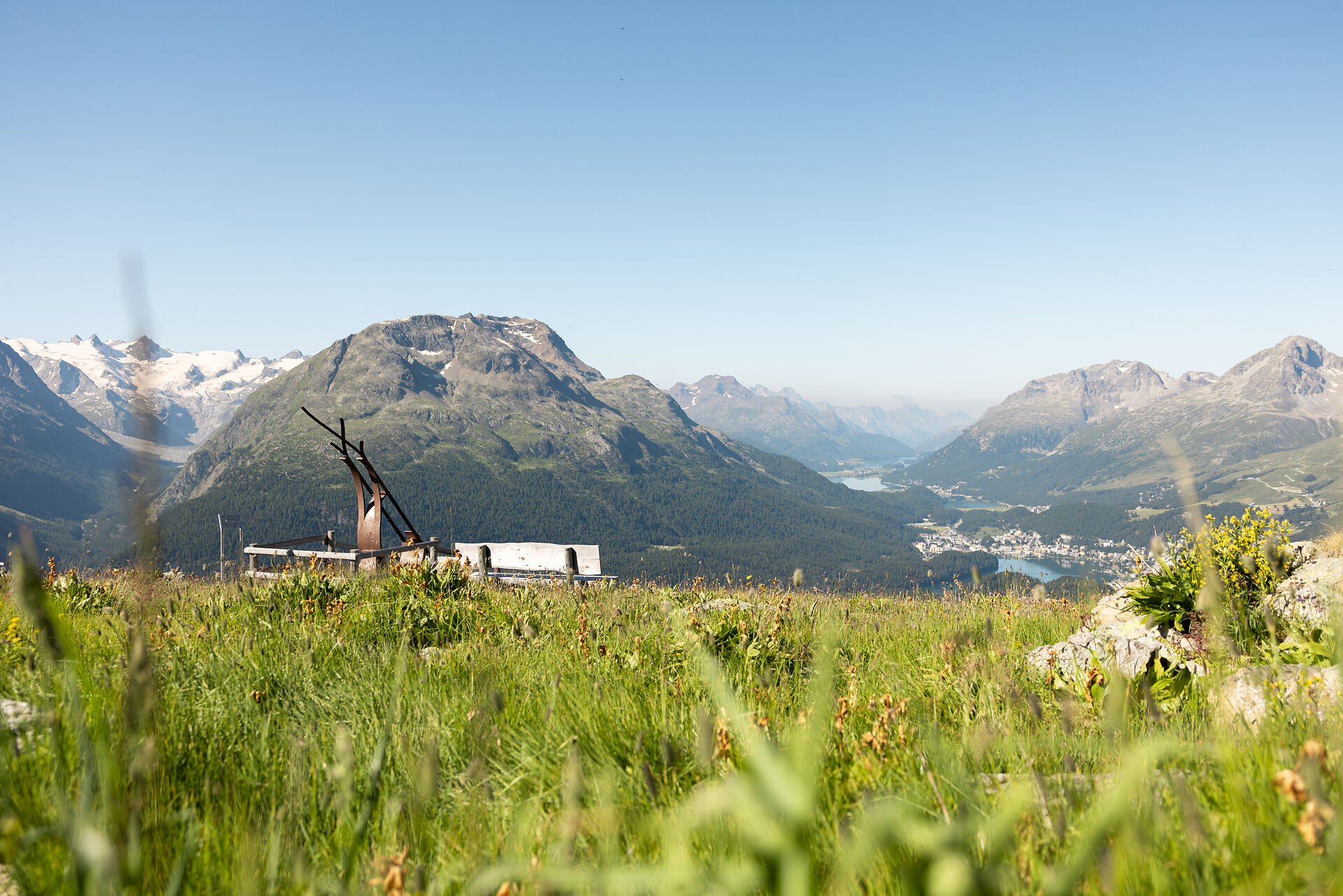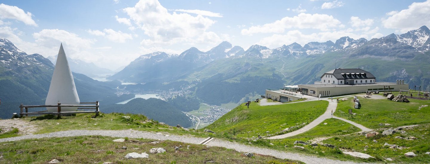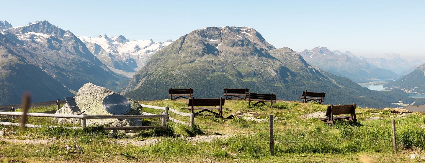 With this unique panorama over the Upper Engadin lake plateau, it is easy to oversee other spectacular lookout points. Take a seat in the «Bernina Glaciers» sculpture, which is crafted out of Engadin Swiss stone pine, and treat yourself to a short break. Allow your gaze to wander across one of the most spectacular mountain views of the Alps: the Bernina Range. In addition to the Piz Bernina, which reaches a height of an incredible 4049 metres above sea level, you will discover other imposing mountain peaks.