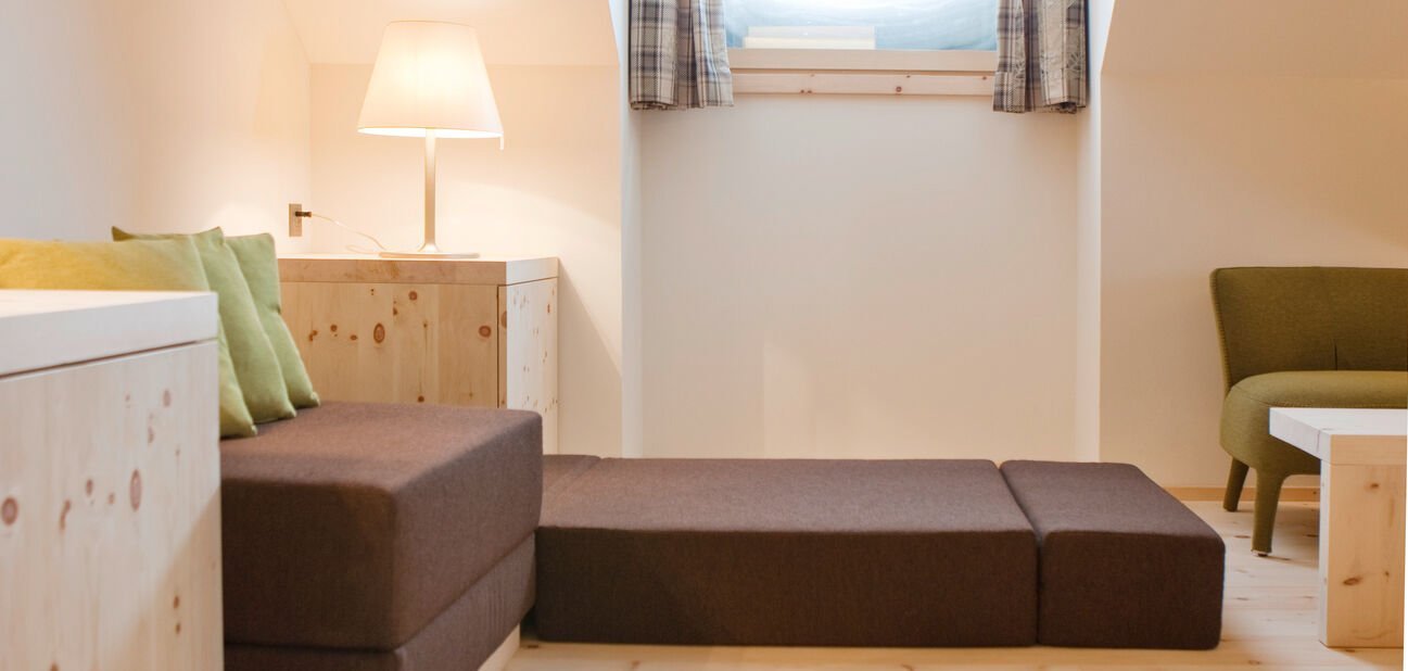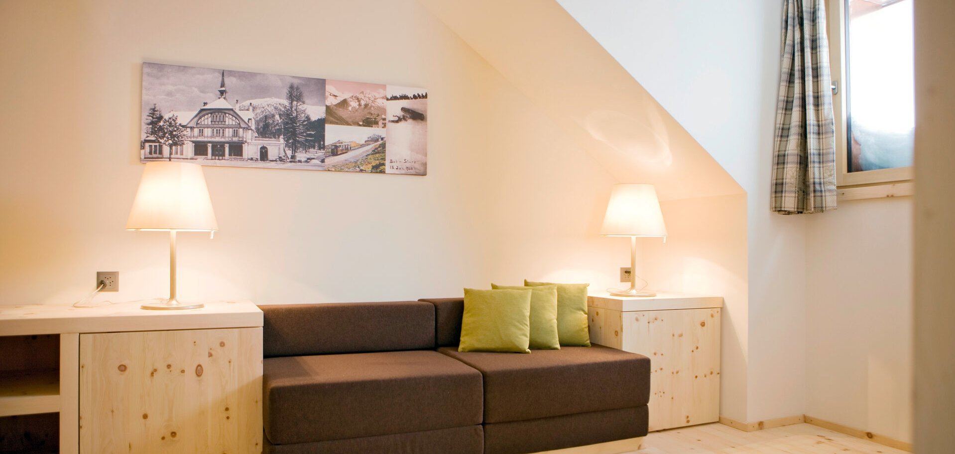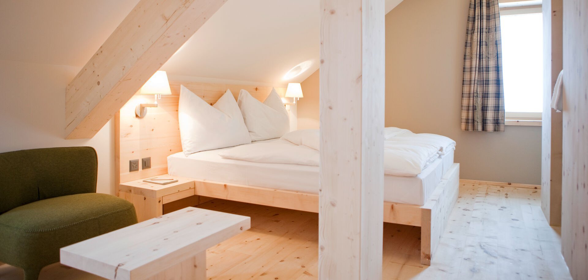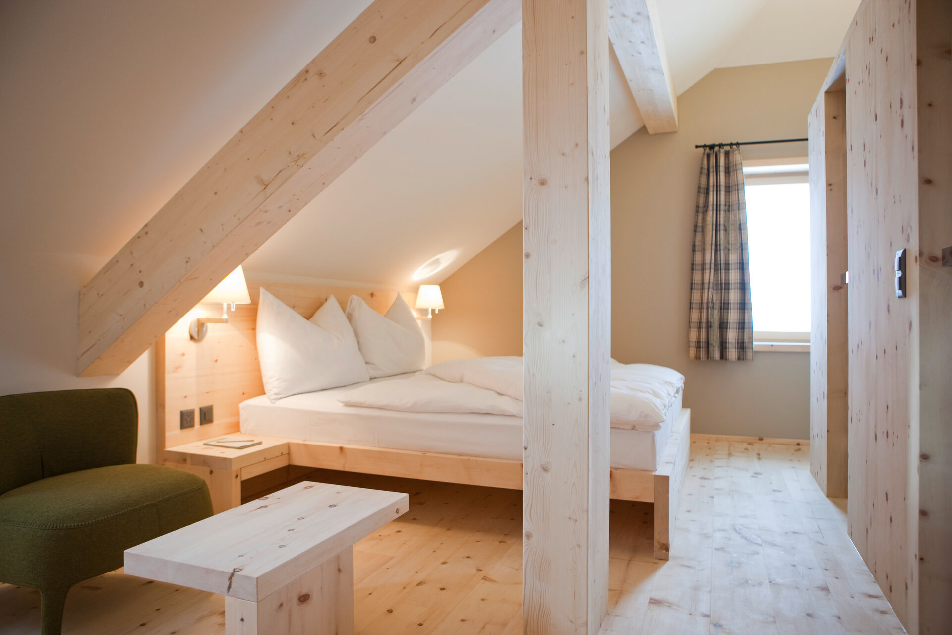 The Roseg double room is our romantic, cosy accommodation with around 22 square metres and a wonderful view of the valley. The room with double bed and cosy sitting area is ideal for an exclusive, romantic short break for two.